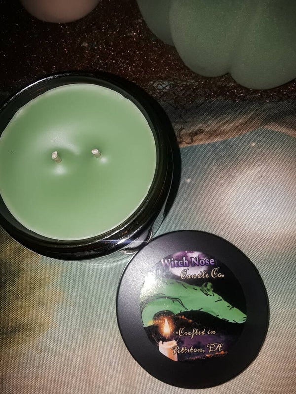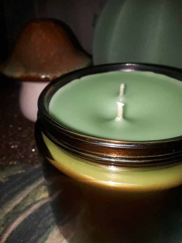 *AMBER GLASS JAR WITH MEDIUM GREEN WAX